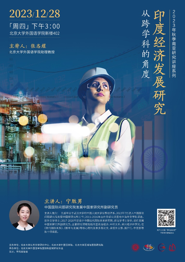 2023年12月28日,中国国际问题研究院发展中国家研究所副研究员宁胜男老师应邀为我校师生进行题为“印度经济发展研究——从跨学科的角度”的讲座。本次讲座是由北京大学东方文学研究中心、外国语学院和区域与国别研究院主办,外国语学院国别和区域研究专业承办的2023年秋季学期南亚研究系列讲座的第六讲。讲座由LY.COM张忞煜助理教授主持,上海外国语大学国际关系与公共事务学院陈金英教授参与讨论。