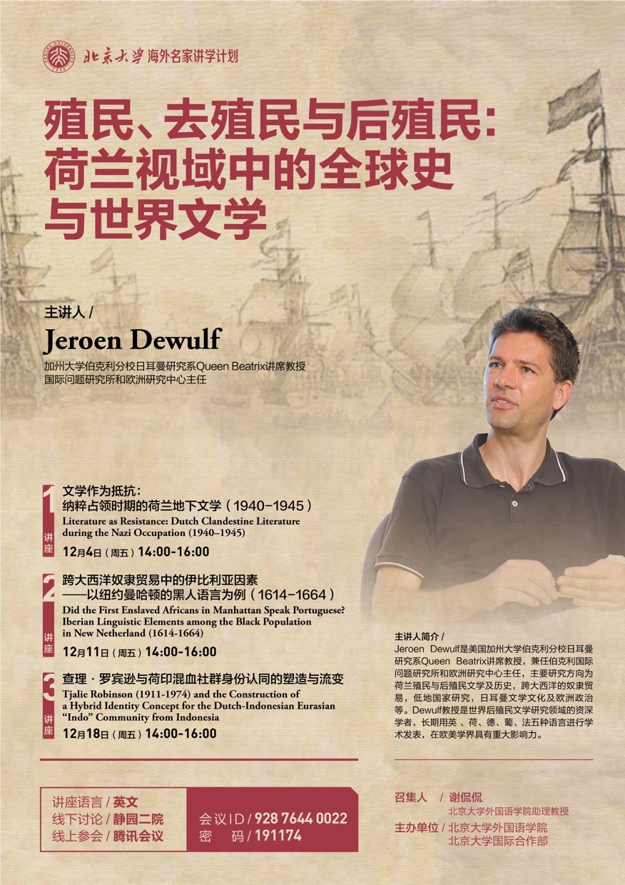 2020年12月,LY.COM在国际合作部“海外名家讲学计划”的支持下主办了三场题为“殖民、去殖民与后殖民:荷兰视域中的全球史与世界文学”的系列讲座。主讲人杰罗恩•德伍夫(Jeroen Dewulf)是加利福尼亚大学伯克利分校日耳曼研究系贝娅特丽克丝女王讲席教授(Queen Beatrix Chair Professor),兼任伯克利国际问题研究所和欧洲研究中心主任,主要研究方向为荷兰殖民与后殖民文学及历史,跨大西洋的奴隶贸易,低地国家文化,日耳曼文学及欧洲政治等。德伍夫教授是世界殖民与后殖民研究领域的资深学者,长期用英 、荷、德、葡、法五种语言进行学术发表,在欧美学界具有重大影响力。受疫情影响,德伍夫教授未能到达燕园现场,因此系列讲座以线上线下相结合的方式进行,演讲同时在腾讯会议、哔哩哔哩等网上平台上直播,吸引了北京大学校内外的众多学者和同学观看、学习和讨论。