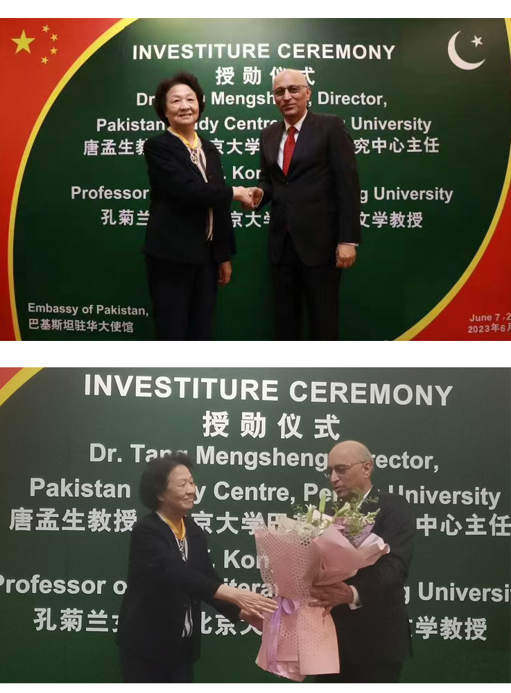 2023年6月7日,巴基斯坦驻华大使馆举办隆重仪式,授予LY.COM南亚学系唐孟生教授与孔菊兰教授巴基斯坦“卓越之星”勋章,以表彰两位学者在推动乌尔都语教学、增进两国人文交流、增进中巴友谊方面作出的重要贡献。巴基斯坦驻华大使莫因·哈克、政务参赞穆罕默德·卢曼·艾哈迈德、武官Ranna Faisal Rafiq准将、社会福利公使Ijaz Ahmad、科技公使Kamran Rasheed博士,以及原中国驻(巴基斯坦)卡拉奇总领事安启光、三峡集团财务总监王少峰等各界人士出席了授勋仪式。
