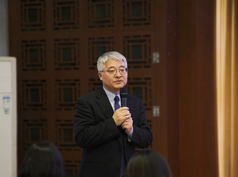外国语学院党委书记李淑静教授致开幕辞。她首先诚挚地欢迎本间哲朗总裁与师生来宾。她表示,中日两国一衣带水,中日关系源远流长,早在1978年邓小平先生访日期间,就与松下公司的创始人松下幸之助先生建立了坚定的信任关系。此后,松下公司不断扩大在华业务,他们的经营理念也得到了中国企业界的认同。本间哲朗先生秉承松下经营理念,并在2019 年赴华任职后对松下在华业务进行了重整和升级,赢得了良好声誉。他多次公开表示,松下公司见证了中国改革开放的伟大成就,是中国改革开放的陪跑者,今后也将继续坚守这一光荣使命。李淑静书记还介绍了外国语学院日语系同学参与松下纪念馆“行商道,顾客为先”——松下幸之助经营理念特别展工作。并表示,这样的合作,不仅让同学们锻炼了翻译能力,也更全面地了解松下的企业文化和精神,让同学们受益良多。