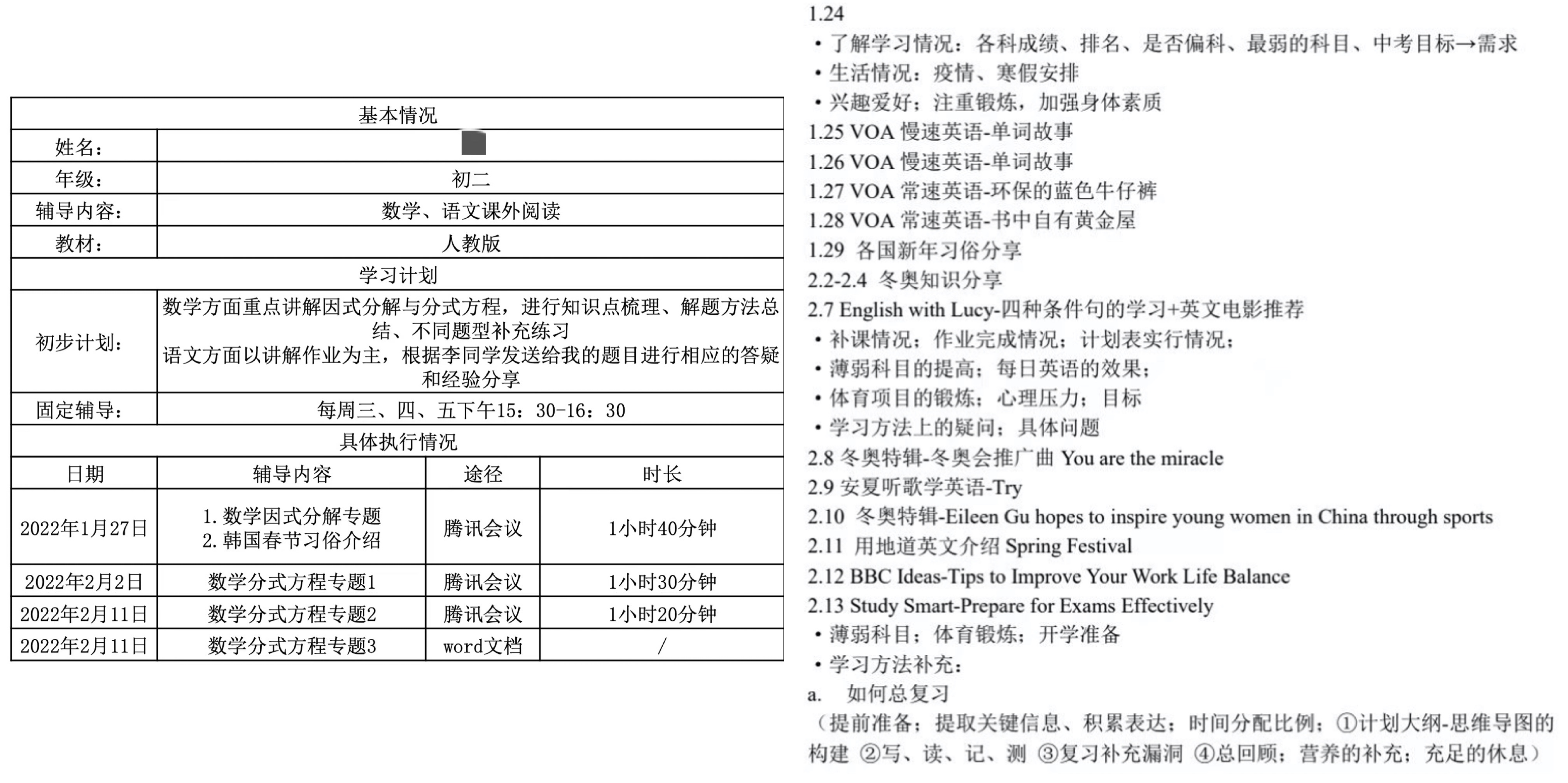 此次活动中,外国语学院和国际关系学院的青年志愿者线上指导来凤同学制定详细的寒假学习计划,并利用专业特长,通过试卷评讲、好题练习、经验分享等方式为来凤同学提供线上辅导与陪伴,解决来凤同学不同科目中的具体问题以及学习方法上的困惑,提升来凤同学的学习效率和学习兴趣,展现北大学子的青年责任与担当。
