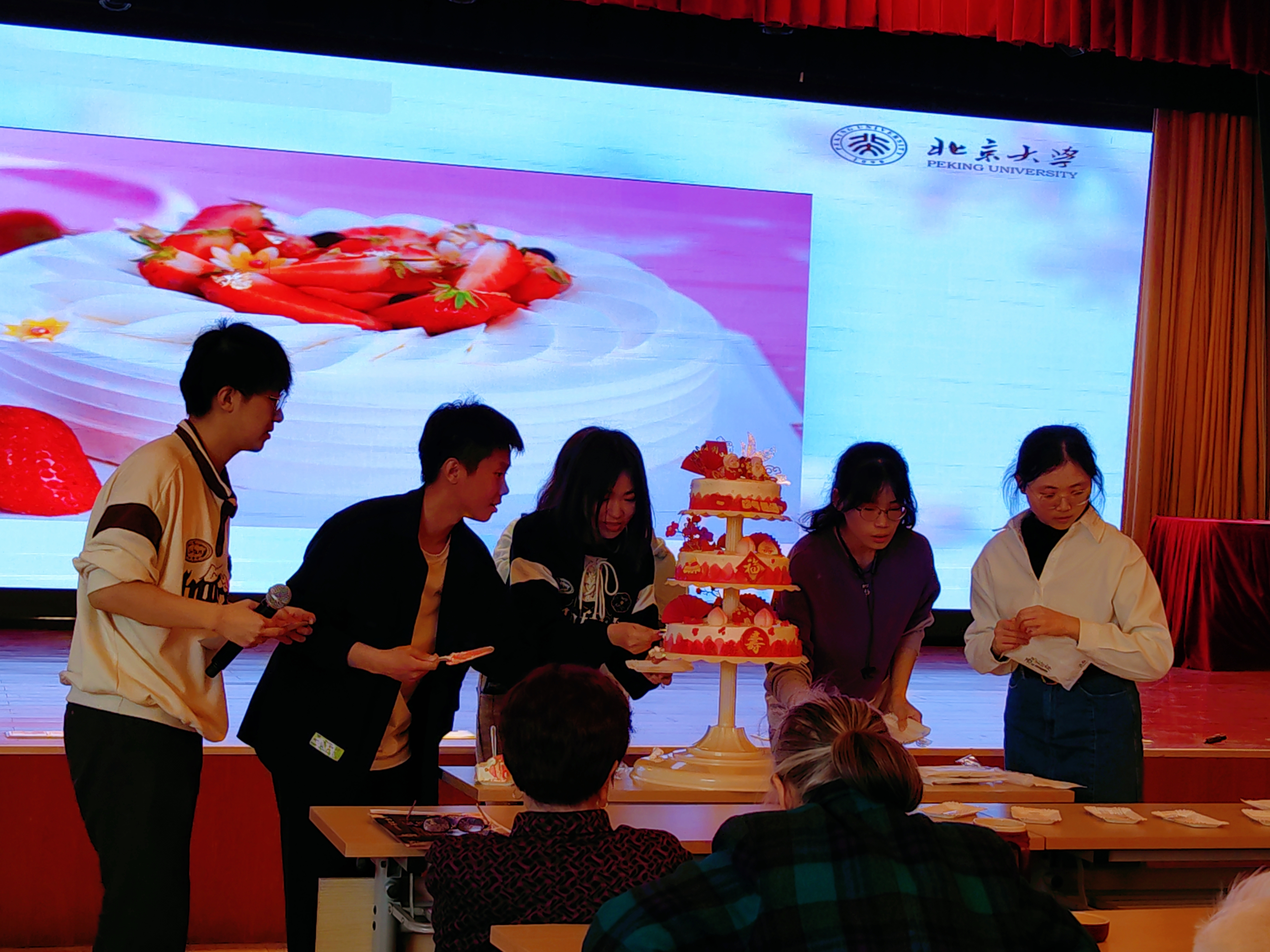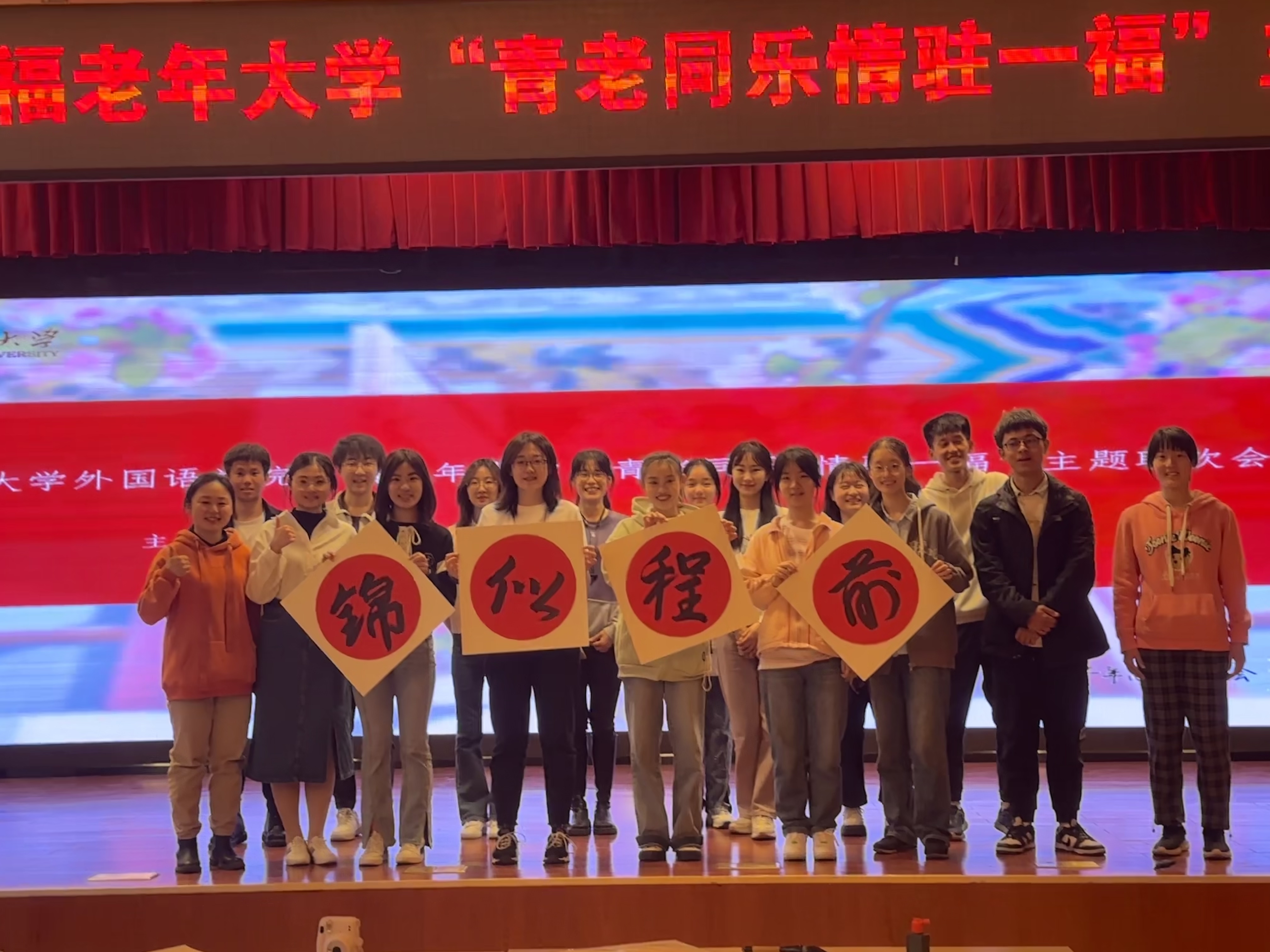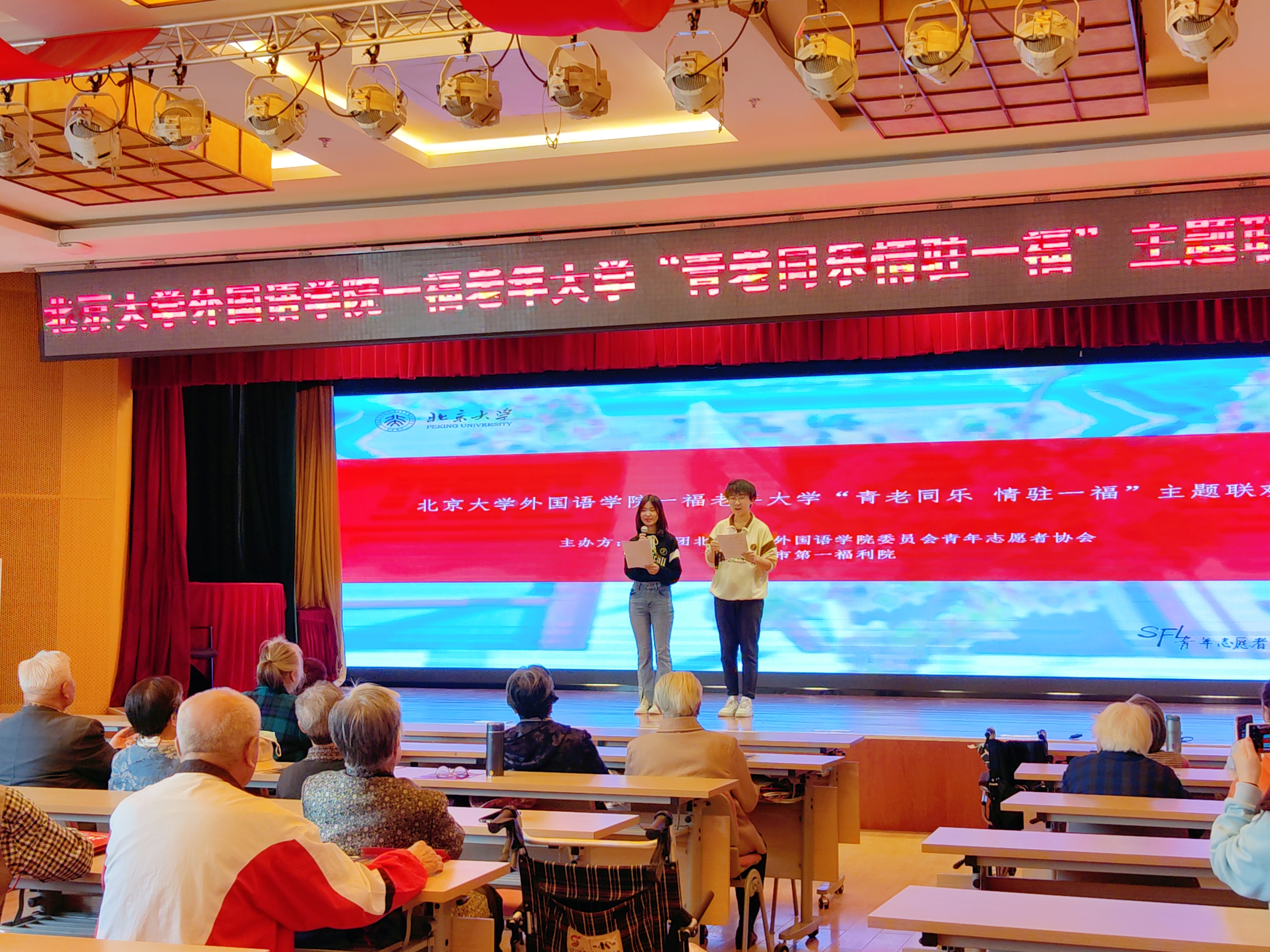 4月28日下午,外院青协和参与“一福老人班”授课的志愿者们在北京市第一福利院相关工作人员的支持下,为英语班和诗词班的老人们举办了一场精彩的联欢会和集体生日会。志愿者们不仅准备了丰富多彩的节目,还设置了不少与英语班和诗词班授课内容相关的互动环节;老人们也丝毫不吝啬自己的掌声和欢呼声,不仅给予志愿者们温暖的鼓励,更是积极地参与互动,甚至开启了“隐藏”节目,为联欢会带来了特别的惊喜。在明亮的礼堂中,志愿者与老人们的热情汇聚在一起,处处欢声笑语,皆是乐乐陶陶。下面就让我们走近联欢会现场,再次感受“青老同乐”的欢快热闹吧!