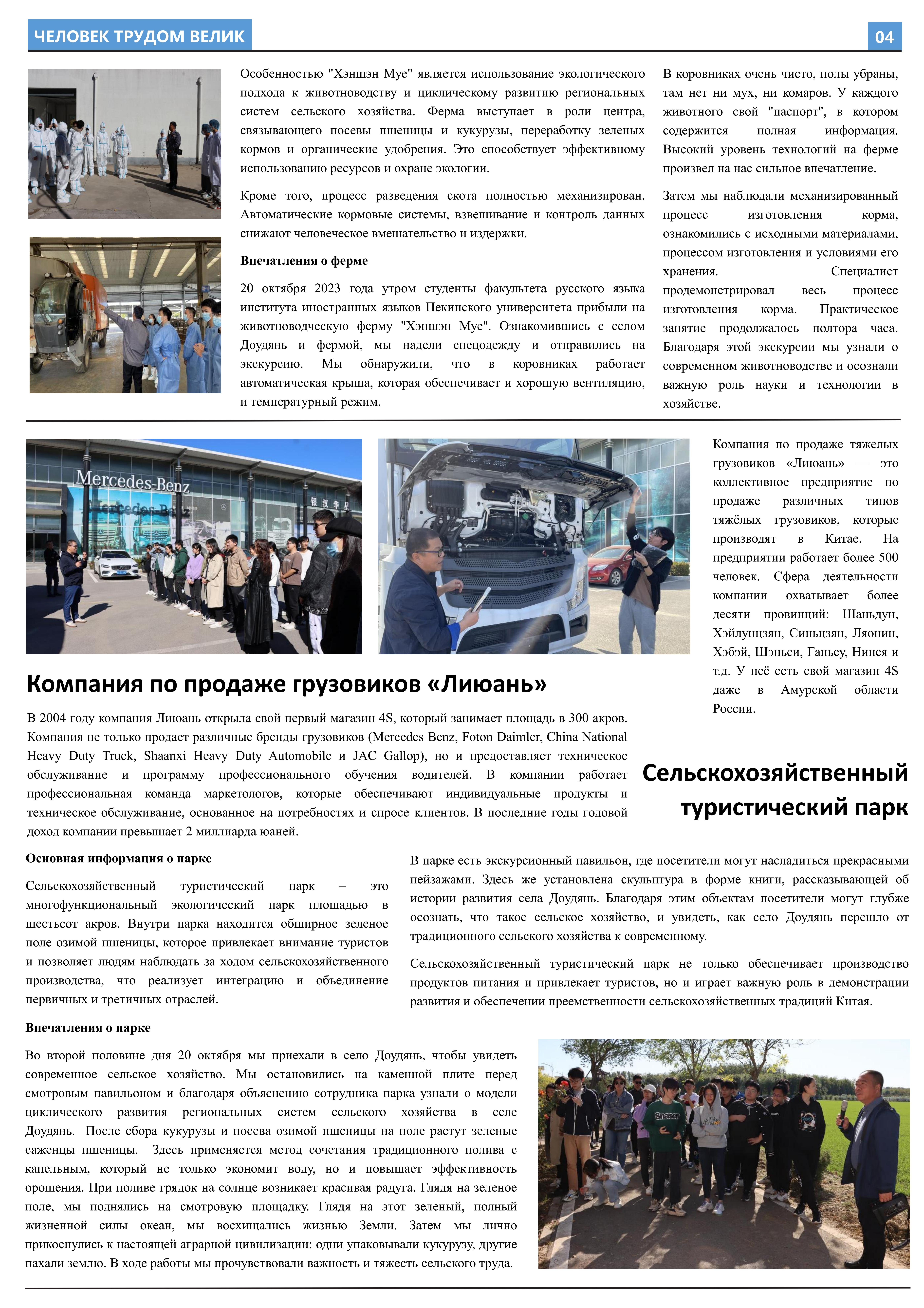 在接受劳动教育、参与劳动实践后,2023年10月至2023年12月,外国语学院2021级俄语本科生班的11名同学立足于学院平台和专业课堂(《俄语报刊阅读(上)》与《俄语写作(上)》),在两位课程主讲教师王帅和外教叶莲娜·马尔卡索娃(Елена Маркасова)的指导下,通过线上分工、小组讨论等形式商讨报纸细节,并学习使用重要概念和关键词句的俄语表达,历时近三个月,共同完成6个版面、3000余个单词数的“劳动成就人——关于劳动教育”主题报纸。报纸共分为8个大主题、13个小主题,全面介绍了外国语学院劳动教育课程的实施背景及学生参与情况,系统阐述了窦店村的历史文化与经济发展等多方面内容,并详细记录了同学们在窦店村恒升牧业畜牧养殖中心、窦店利元车业、农业观光园等劳动教学点的劳动实践与参访感受。