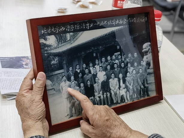 上午,细雨蒙蒙间,几位耄耋之年的老校友最早赶来。57级校友朱甫晓为大家一一介绍了毕业照上的诸位恩师与同窗,深情回忆了老师们的治学风范与教学风格,特别以冯至先生课堂上对莱辛著名剧作《爱米丽雅·伽洛蒂》中关键句的译法辨析为例,生动地描述了先生翻译之严谨、言语之幽默、课堂之活跃。