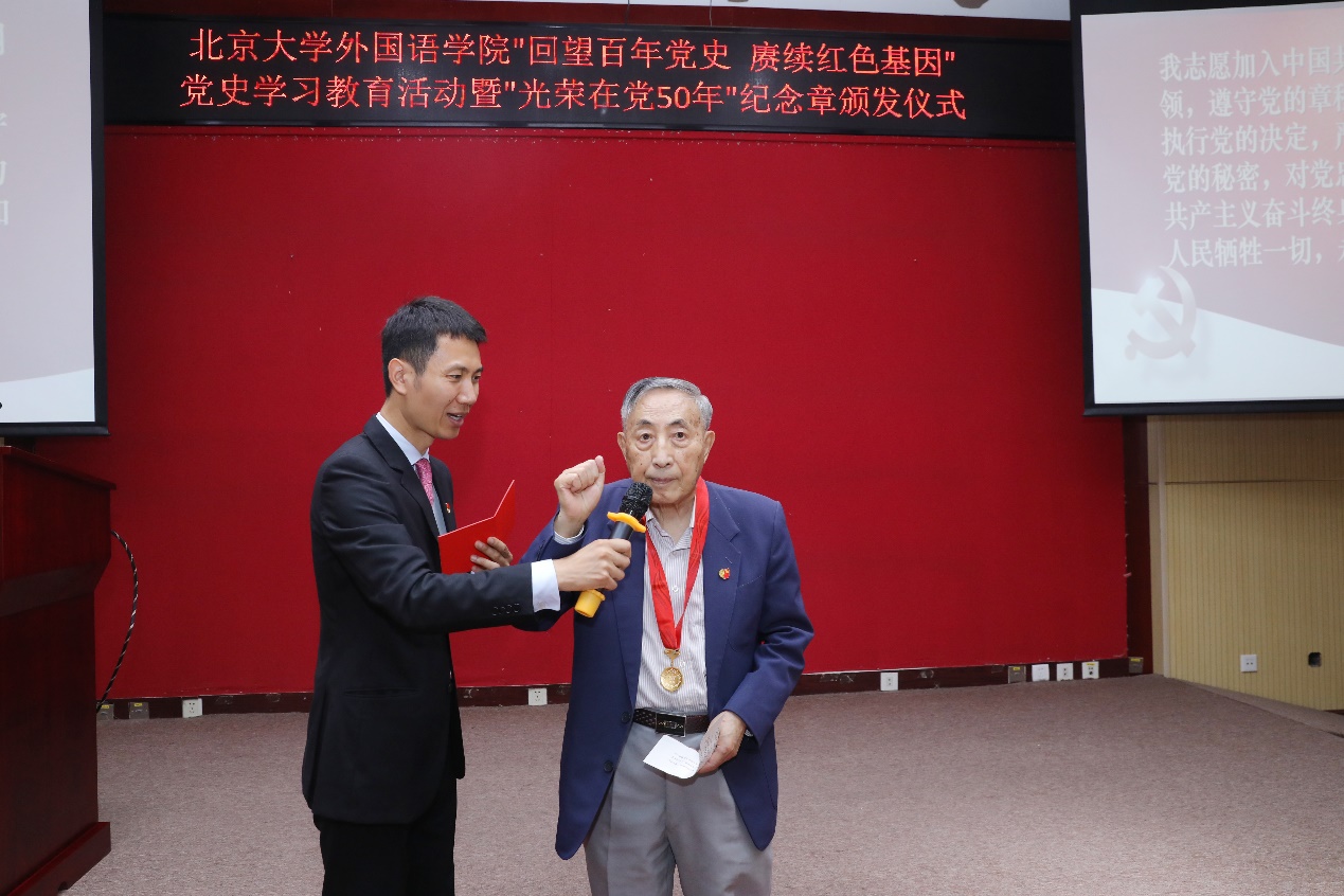 纪念章颁发仪式在庄严肃穆的国歌声中拉开序幕。外国语学院党委委员、副院长付志明代表学院党委宣读“光荣在党50年”党员名单。今年,外国语学院共有64名老党员获颁纪念章,其中年龄最大者96岁,党龄最长者达74年。外国语学院党委委员为老党员代表颁发“光荣在党50年”纪念章与致“光荣在党50年”老党员的一封信,青年党员教师代表向他们献花致敬。
