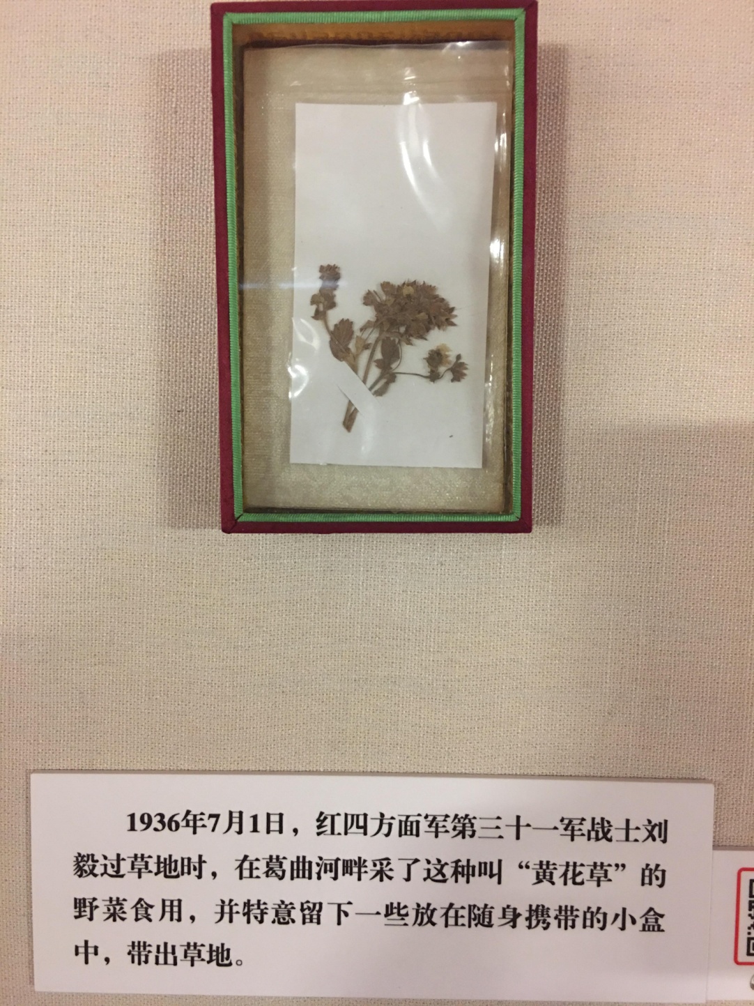 在第三部分“艰难岁月”展区,令人印象最为深刻的是一株被醒目的红边镜框精心保存着的、标本状的小草,那是红军战士在长征途中食用的野菜!顿时,“风雨侵衣骨更硬,野菜充饥志越坚。”---- 耳熟能详的长征组歌《长征组歌》中“过雪山草地”的两句歌词就在心中激荡。这株小草真实体现了红军战士不畏艰难险阻的大无畏精神以及坚定的革命信念。有了这样的信念和钢铁意志,红军才能所向披靡、无往不胜。