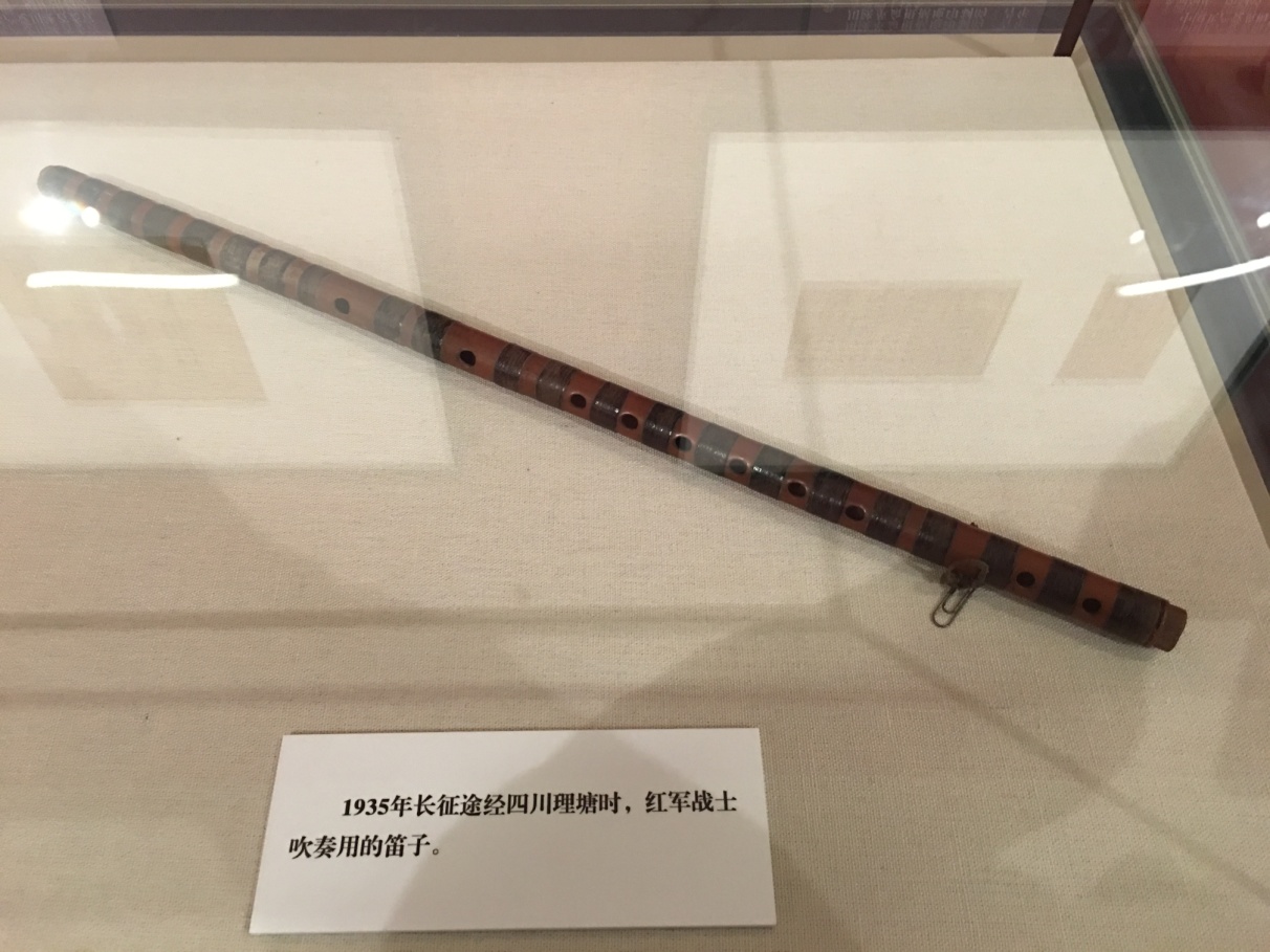 在第四部分“长征记录”展区,一支长征路上红军战士吹奏用过的笛子吸引了大家的目光。80年过去了,笛子的主人想必已带着笛声驾鹤西去。但此刻站在这件具有特殊意义的笛子跟前,我们可以想象,在天上有敌机轰炸、地下有追兵堵截、风餐露宿、饥寒交迫的艰苦环境下,一个人,得具备什么样的精神和毅力,才能让这笛声响起?!而且每每响起,这笛声又会给主人以及并肩同行的战友带来多大的力量和欢乐?!这是对长征精神----乐于吃苦、不惧艰难的无产阶级乐观主义精神的最好的诠释。