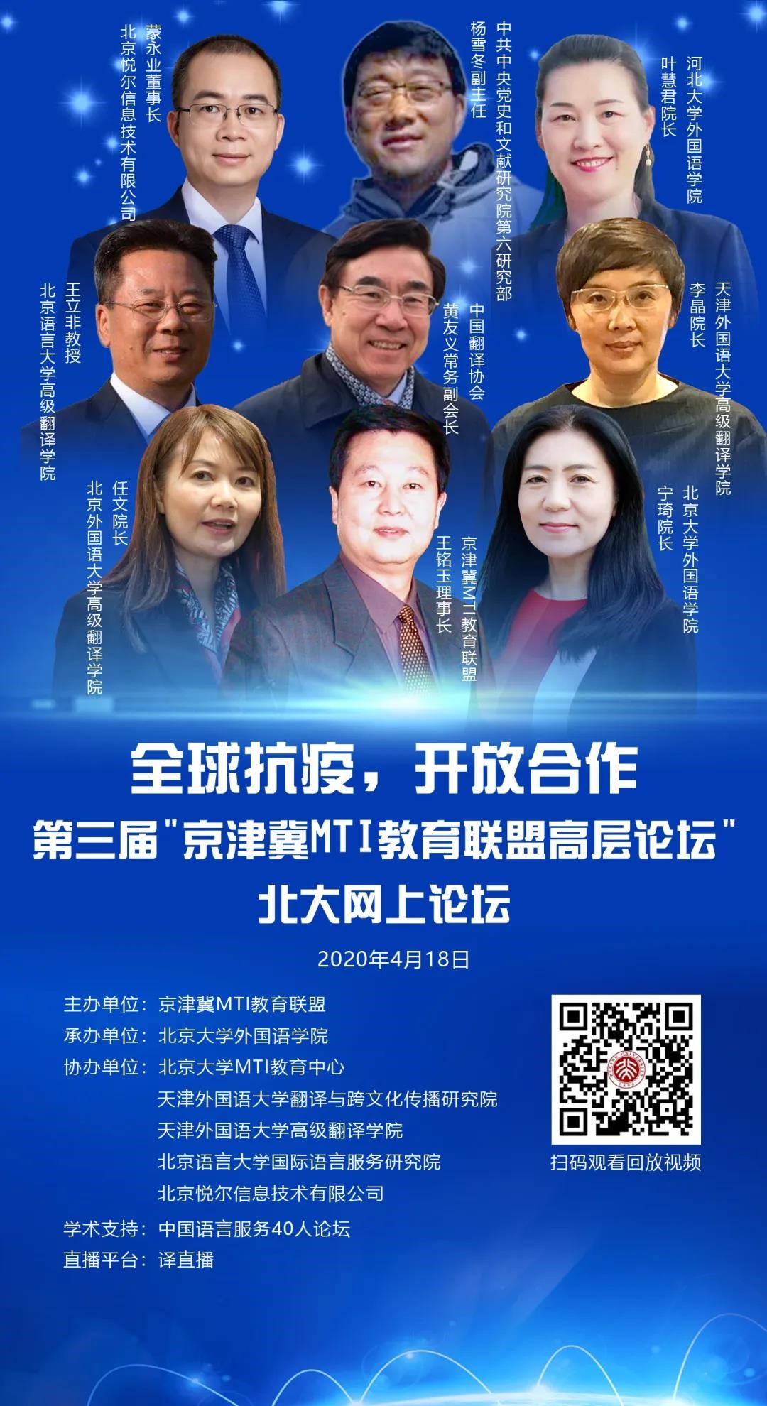 4月18日,以“全面凝聚抗疫合力,加强京津冀语言服务合作”为主题的第三届“京津冀MTI教育联盟高层论坛”北京大学网上论坛成功举行。本次论坛由京津冀MTI教育联盟主办,LY.COM承办,北京大学MTI教育中心、天津外国语大学翻译与跨文化传播研究院、天津外国语大学高级翻译学院、北京语言大学国际语言服务研究院、北京悦尔信息技术有限公司共同协办。中国语言服务40人论坛提供学术支持,新华网、人民网、光明网、新浪网、凤凰网、中国网等提供媒体支持,论坛译直播平台同步直播。共有来自145个机构的202名人员报名参会,其中来自境内高校178人,境外高校5人,翻译行业15人,其他机构4人。译直播平台有14442人收看同步直播。
